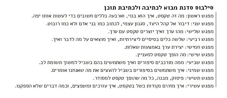 בסדנת המבוא לכתיבה יש מבוא לטקסטים, לסיפורים וליצירתיות. אנחנו נלמד מה זה בכלל טקסט; איך הוא נראה ואיך הוא נשמע, איך מדייקים אותו למי שאמור לקרוא אותו, איך יוצרות בו סדר והיגיון ואיך הוא נותן תחושה של טקסט מובן ולא כאילו מישהו הטיח את הכל על הדף. אנחנו גם נדבר על מה זה סיפור ואיך כותבים אותו, וגם נתעסק בתהליכי יצירה ובאיך יוצרים הרבה תוכן במעט זמן. זו סדנה יחסית טכנית (אבל יש לה נשמה), עם הרבה כלים מסודרים, שבוודאי תשפר את הכתיבה שלך. אפשר לראות את הסילבוס (הזמני) כאן.